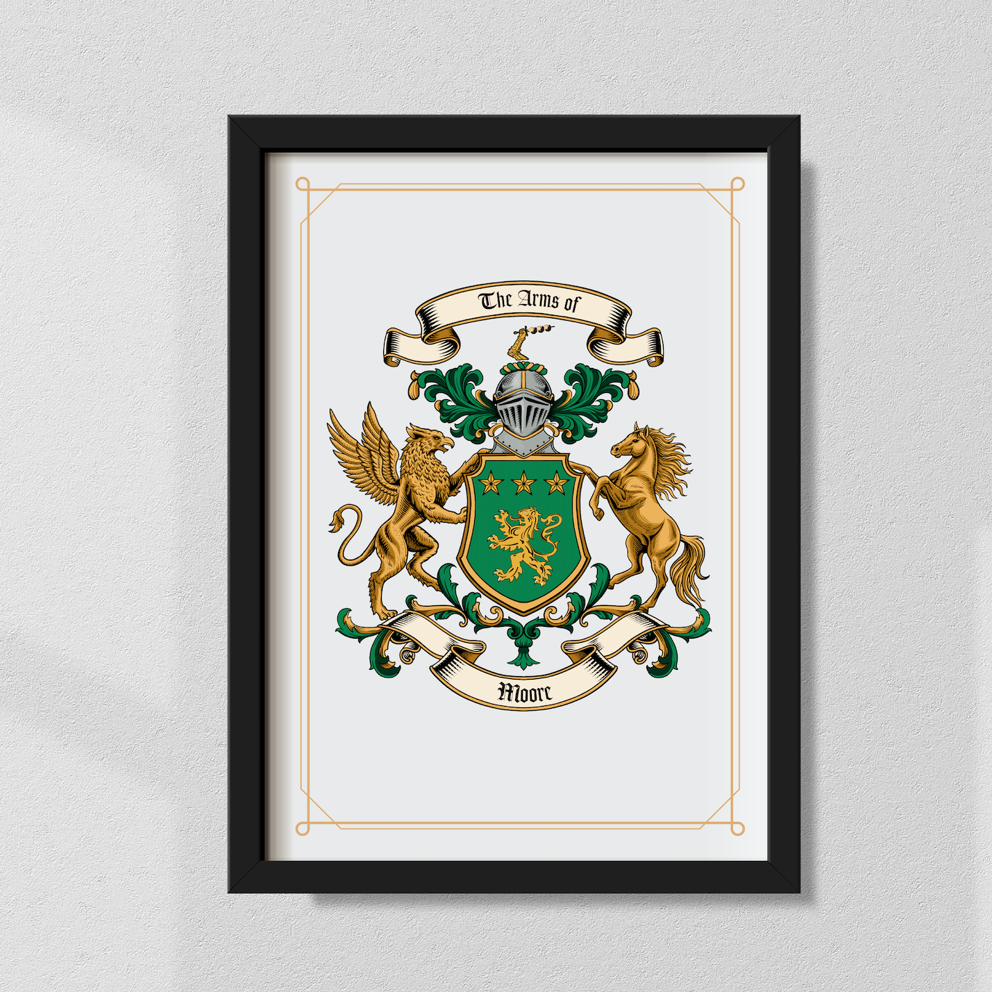 Couldn't load pickup availability 'Crest print with border' in digital format is delivered as digital PDF vector file. They open easily on any home computer, tablet or mobile and can be sized up or down with perfect quality. They also come ready formatted to be printed on home printers. THIS FRAME fits our digital prints (print at home). To order: add your family name to the box and click 'add to cart'. You can then checkout using your favourite payment method. We'll get to work right away. Rest assured that your family crests and history products will arrive in pristine condition. Framed prints: will be shipped in recycled cardboard packaging with with an additional layer of protective wrapping inside the cardboard. These will also have no outer markings on the box so if you're buying as a gift you can order with confidence that the recipient won't accidentally see your surprise. Digital file delivery: Our digital files allow you to use your crest or history in unlimited ways in your own time. Perfect for printing and framing at home, adding to family trees or school projects. Digital print files will arrive as high quality PDF vector format in USA letter size, already formatted for most standard printers and ready to go at the click of a button. Ideal for last minute gifts or for those arts & crafts enthusiasts. If you purchase a digital pack, your order will also include PNG, jpeg and .Ai files. We're proud to say that the majority of our orders are dispatched from our premises within 1-3 working days of ordering (Monday to Friday). For more details on when your products are likely to reach you, please read below. Digital file delivery: Delivered by email typically within 1-3 working days (Monday to Friday). Our digital files allow you to use your crest or history in unlimited ways in your own time. Perfect for printing and framing at home, adding to family trees or school projects. Digital print files will arrive as high quality PDF vector format in USA letter size, already formatted for most standard printers and ready to go at the click of a button. Ideal for last minute gifts or for those arts & crafts enthusiasts. If you purchase a digital pack, your order will also include PNG, jpeg and .Ai files. Delivery options for continental United States (physical prints) We dispatch 90% of our orders within 1-3 working days after the order is placed (Monday to Friday). The following shipping times then apply. Priority Mail - Fast Dispatch delivered via USPS. Estimated timeline for delivery in 5 - 7 business days. Please note, occasionally this timeline cannot be guaranteed at busy periods due to limitations in USPS services. FedEx Priority or Next Day Air (when available) Ideal for if you're in a hurry, 1-2 business days on average after dispatch. This option is also not available for delivery to PO Boxes. *Please note dispatch and delivery times are esimtates and cannot be guarenteed at busy periods or during times when carriers experience delays. We unfortunately cannot control delivery once the product has been passed to postal carriers. 'Satisfaction guaranteed' is what we live by. We've built a reputation based on honesty, integrity and customer service. We promise that you'll love the product that you receive and we're so sure of it that we offer all customers 30 days to enjoy their crest or history products before deciding if they meet quality expectations. For more details on our returns process and policy, please see here. If you have a question about this or anything else, please don't hesitate to drop us a message and we'll get back to you asap. You can also reach the team at support@crestsandarms.com